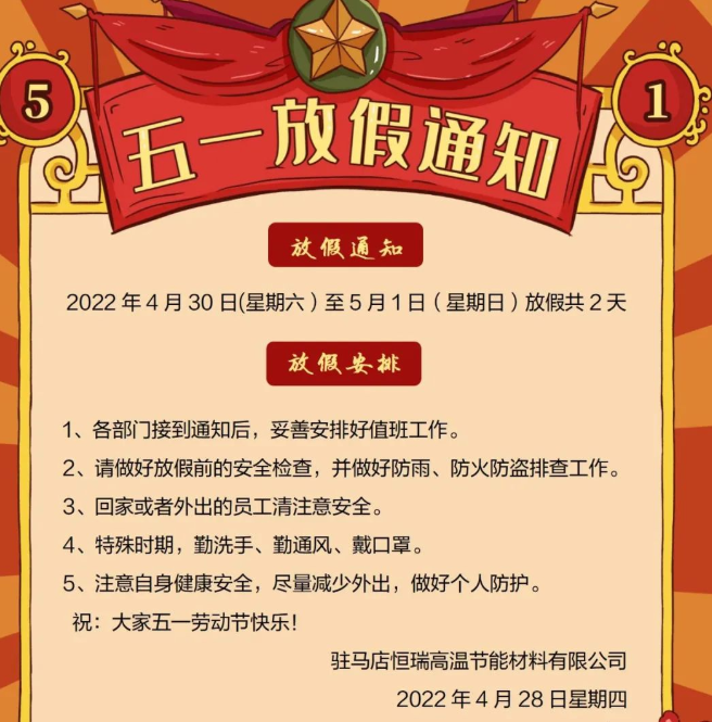 响应国务院办公厅通知精神,我司2022年五一劳动节放假安排如下:2022年4...